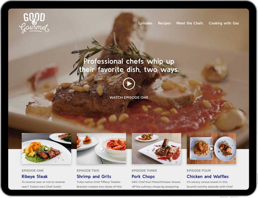 What’s the difference between home cooks and culinary masterminds? To build awareness of the benefits of cooking with natural gas, the Hahn Agency created a Good vs. Gourmet cooking series for Oklahoma Natural Gas (ONG). In the 4-episode series, professional Oklahoma chefs whipped up their favorite homemade dish two ways: good and gourmet.
