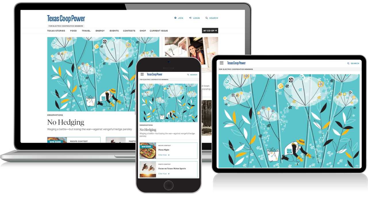 Texas Co-Op Power (TCP) is a magazine published by Texas Electric Cooperatives that offers the best of Texas stories along with important news and information from reader’s electric co-ops. The print magazine is circulated to more than 1.7 million co-op members, and the website provides an elevated digital experience with exclusive online content and features.